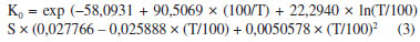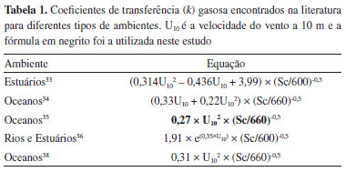 A determinação da pCO2 obedece a metodologia descrita por Dickson, Sabine e Christian (2007), onde ocorre o equilíbrio entre um volume fixo de ar e um fluxo corrente de água por um equilibrador do tipo showerhead. O fluxo gasoso seco, uma vez que passa por armadilhas físicas e químicas (condensador e perclorato de magnésio) para a retirada da umidade, é direcionado para o detector de infravermelho não dispersivo (LiCor 7000, Inc., EUA), que mede a fração molar do CO2 (xCO2). Para as medidas da pCO2, em tempo real no estuário, o detector foi calibrado com quatro padrões com teores de CO2 certificados pelo fabricante (nitrogênio puro: 0 ppm de CO2; padrão baixo: 280,6 ppm de CO2; padrão médio: 500,9 ppm de CO2; e padrão alto: 1002 ppm de CO2). O equipamento é acoplado a um notebook que controla todas as operações desde a coleta da água até a determinação final da pCO2 através de programa em ambiente Labview 11. A conversão da fração molar medida pelo detector para pCO2é realizada para os valores nas duas interfaces, água e ar. Na Equação 1, patm é a pressão barométrica no equilíbrio, a qual se assume ser igual à pressão atmosférica na superfície do estuário e pH2O é a pressão do vapor de água.27 ![]() Estimativa indireta da pCO2 Medições de parâmetros do sistema carbonato: alcalinidade total e pH A estimativa indireta da pCO2 foi obtida através da análise do pH e da alcalinidade total (AT). Amostras de água superficial foram coletadas em frascos de 500 mL de borosilicato com adição de cloreto de mercúrio (HgCl2) para cessar a atividade biológica nas amostras. Em seguida, foram armazenadas em local escuro e arejado para posterior análise no Laboratório de Biogeoquímica Costeira - LBC. A determinação da AT foi realizada pelo método de titulação potenciométrica em cela aberta.28 O pH foi determinado in situ através de um pHmetro Metrohm 826, previamente calibrado com soluções tampão de pH 7 e 9. Estimativa da pCO2 através do software CO2sys Para a estimativa indireta da pCO2 foram utilizados os valores de AT e pH juntamente com os dados de salinidade e temperatura medidos in situ, utilizando o programa CO2Sys v.2.1.29,30 Para o cálculo, foram usadas as constantes de dissociação K1 e K2 de Mehrbach (1973) reajustadas por Dickson e Millero (1987) e constantes de sulfato e borato propostas por Dickson 1990 e Lee et al. 2010, respectivamente.31,32 Cálculo dos FCO2 Os fluxos líquidos de CO2 foram obtidos pelo produto entre a diferença entre a pressão parcial do CO2 na superfície da água e no ar (ΔpCO2), o coeficiente de solubilidade do CO2(K0) e o coeficiente de transferência gasosa (k) (Equação 2): ![]() Na convenção adotada, valores positivos (negativos) de ΔpCO2 indicam emissão (absorção) de CO2 para a atmosfera. O coeficiente de solubilidade do CO2 (K0) foi determinado em função da temperatura da superfície da água (em Kelvin) e de sua salinidade, e dado em mol L-1 atm-1 (Equação 3).28 ![]() O coeficiente de transferência gasosa (k) é influenciado pelo vento local e possui diferentes parametrizações amplamente utilizadas na literatura (Tabela 1).33,34,35,36,37 No presente estudo, três parametrizações foram testadas para o estuário do Rio Jaguaribe.33,35,36 Para o cálculo dos FCO2, utilizou-se a parametrização da Equação 4, considerada ideal para as temperaturas e salinidades observadas no estuário do Rio Jaguaribe.35 ![]()
