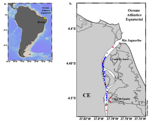![]() Figura 1. Mapa do Brasil com destaque para o estado do Ceará (a); mapa de amostragem das campanhas de julho/2015 (pontos em azul) e de novembro/2015 (pontos em vermelho) (b); em destaque os canais secundário amostrados Canal do Amor e Canal do Cumbe