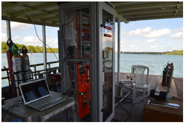 ![]() Figura 2. Equipamento de medição em tempo real da pCO2 em missão realizada em julho de 2015 no estuário do Rio Jaguaribe (foto: de Silva, A. R. F.)