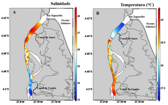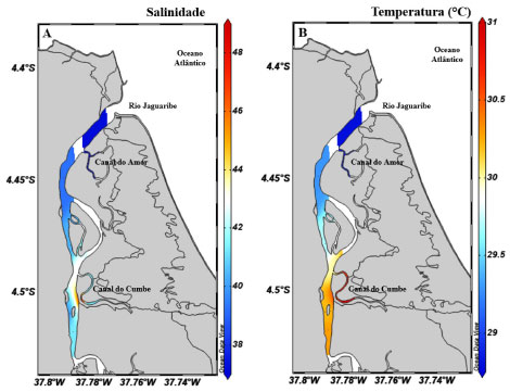 ![]() Figura 8. Distribuição espacial da salinidade (a) e da temperatura (b) em novembro de 2015