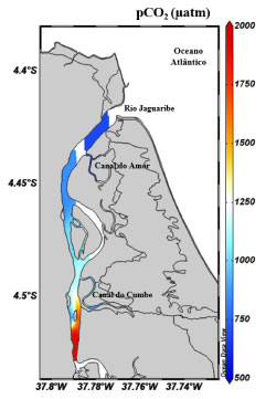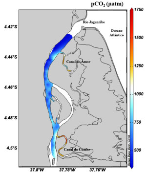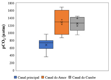![]() Figura 4. Valores de pCO2 no estuário do Rio Jaguaribe considerando o canal principal (azul), e os canais de maré de mangue; Canal do Amor (laranja) e Canal do Cumbe (cinza)
