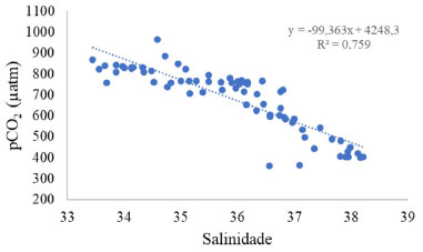 Considerando apenas o canal principal (n = 65), a distribuição da pCO2 apresentou uma correlação negativa significativa com a salinidade (R2 = 0,76, p < 0,01), indicando a influência da intrusão das marés na distribuição espacial da pCO2 (Figura 6).