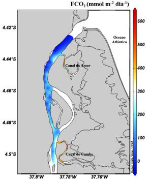 A pCO2 na água variou entre 361,5 µatm e 1694,1 µatm, enquanto que na atmosfera os valores de pCO2 foram em média 397,2 ± 2,3 µatm. Os valores mais elevados de pCO2 foram encontrados nos canais de maré de mangue (Amor e Cumbe). Considerando apenas o canal principal do estuário, a pCO2 variou entre 361,5 próximo a desembocadura na plataforma continental adjacente e 965,3 µatm, apresentando média de 687,1 ± 148,4 µatm. Os valores do Canal do Amor variaram entre 601,8-1694,1 µatm, e em média foram 1027,5 ± 406 µatm. Para o Canal do Cumbe, a pCO2 variou entre 831,3-1446,6 µatm, e foram em média 1177,8 ± 243,7 µatm (Figura 4).