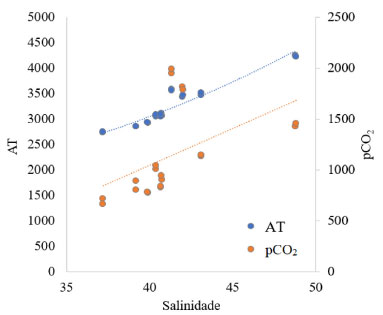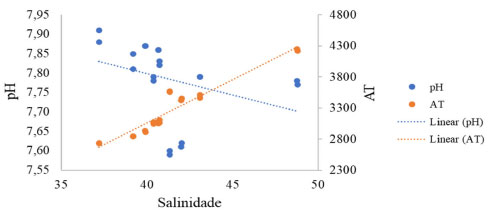 ![]() Figura 9. Relação entre o pH (azul) e AT (laranja) com a salinidade