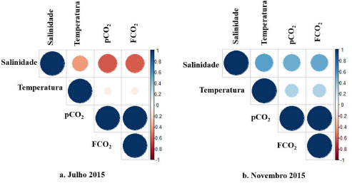 ![]() Figura 12. Correlação entre as variáveis: salinidade, temperatura, pCO2 e FCO2 para o estuário do Jaguaribe em julho de 2015 (a) e em novembro de 2015 (b). A barra de cores indica azul como correlações positivas e vermelho como correlações negativas. O tamanho do ponto no diagrama indica a força da correlação. As correlações com p > 0,05 foram deixadas em branco