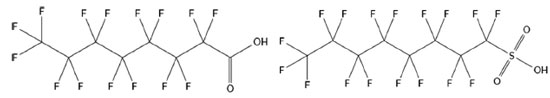 CARACTERÍSTICAS FÍSICO-QUÍMICAS A substituição de átomos de hidrogênio por átomos de F na cadeia carbônica rende às moléculas fluoradas características únicas em função das propriedades atômicas deste halogênio. Dentre as principais propriedades do F, destaca-se a sua elevada eletronegatividade, que torna a ligação C-F a mais forte ligação entre os compostos orgânicos e, ao mesmo tempo, fortemente polarizada. Isso resulta na elevada estabilidade térmica e química desses compostos, sendo eles resistentes a ataques por ácidos, bases, oxidantes, entre outros.21 22 23 A baixa polarizabilidade do F associado ao seu elevado potencial de ionização confere às moléculas fluoradas uma efêmera força de atração inter e intramoleculares, resultando na baixa tensão superficial se comparado a outros compostos orgânicos, além do comportamento anfipático.22 23 24 A hidrofobicidade dos PFAS varia em razão do número de carbonos da molécula, quanto maior o comprimento da cadeia, maior a hidrofobicidade.23 Contudo, adições de radicais como ácido sulfônico, ácido carboxílico e fosfato torna parte da molécula hidrofílica, dando a essa substância propriedade surfactante.22 23 24 Essa característica impossibilita a determinação do coeficiente de partição octanol-água (Kow) de forma experimental, já que, quando dispersos na solução bifásica os PFAS com propriedades surfactantes tendem a formar uma terceira fase entre o octanol e a água.25 Com relação às características físico-químicas dos dois compostos mais estudados e com maior ocorrência ambiental (PFOS e PFOA, Figura 1), o PFOS possui elevada solubilidade em água, chegando a 680 mg L-1 a 25 °C, sendo que na água do mar esse valor é reduzido a 25 mg L-1.25 O coeficiente de partição sedimento água, normalizado pelo carbono orgânico (log Koc) do PFOS, é 2,57, embora Ahrens e colaboradores tenham verificado valores de 3,7.26,27 A constante de dissociação ácida (pKa) do PFOS é 0,14, sugerindo que, quando em solução, estes compostos estão majoritariamente na forma ionizada, o que dificulta a sua volatilização, apesar da pressão de vapor ser 2 × 10-3 mmHg (20 °C).25 Para o PFOA foram reportados valores de solubilidade elevados quando comparados a outros contaminantes halogenados como os PCBs e PBDEs, chegando a 9500 mg L-1 (25 °C) (ATSDR, 2021).28 Seu log Koc foi calculado em 2,4 e 2,1, aplicando metodologias semelhantes.26,27 O pKa dessa substância é estimado em 3,8 e, da mesma forma que o PFOS, indica que em solução a maior parte das moléculas estarão na sua forma iônica.28,25