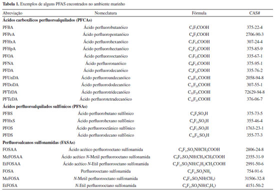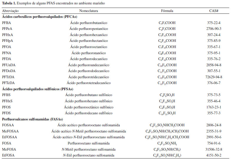 I. Departamento de Oceanografia, Universidade Federal de Santa Catarina, 88061-600 Florianópolis - SC, Brasil Recebido em: 06/12/2022 *e-mail: j.leonel@ufsc.br Per- and polyfluorinated compounds (PFAS) have been produced for more than seven decades and widely used in the most diverse areas, from food packaging, textile industry, aqueous film-forming foam to pesticides and surfactants. However, the characteristics that allow the wide range of applications also bring environmental concerns due to their persistence and toxic effects. Although the ocean might be the final destination of PFAS, in Brazil few studies have been carried out about PFAS and there are many gaps regarding their environmental occurrence, sources and distribution. Therefore, this article presents a review of the production, use, behavior in the environment, legislation, the occurrence of classic PFAS in the Brazilian marine environment, as well as perceptions about their fluorinated substitutes. INTRODUÇÃO A Década da Ciência Oceânica (2021-2030) tem como um dos objetivos garantir um Oceano Limpo através do incentivo às pesquisas científicas e inovações tecnológicas que possam prevenir/reduzir a poluição e garantir a saúde do oceano.1 Para isso, é necessário identificar os principais grupos de contaminantes que atingem os ambientes marinhos, bem como conhecer suas fontes e entender seu comportamento ambiental. Entre os diversos grupos de compostos que causam impactos negativos ao ambiente e aos seres humanos, destacam-se os compostos per- e polifluoroalquilados (PFAS). Os PFAS são compostos sintéticos, produzidos através da substituição dos átomos de hidrogênio da cadeia carbônica por flúor. Por conta disso, possuem elevada estabilidade química e térmica, além de características anfipáticas. Eles compõem um grupo de mais de dez mil contaminantes com ocorrência reportada nos mais diversos ambientes, incluindo regiões remotas do globo e oceano profundo.2 3 4 5 6 8 Embora os PFAS já sejam produzidos há mais de 70 anos e amplamente utilizados em, por exemplo, embalagens para alimentos, indústria têxtil, espumas anti-chamas e praguicidas, só recentemente esses compostos passaram a chamar atenção da comunidade científica por sua persistência no meio ambiente e toxicidade.9 Estudos indicam que os PFAS estão associados a alterações no sistema nervoso, reprodutor, metabólico e hormonal, além de possuírem potencial hepatotóxico e carcinogênico em humanos.10 11 12 A exposição a esses contaminantes também está associada a alterações morfológicas e comportamentais em peixes.13,14 A alta resistência dos PFAS a remineralização faz com que sejam as substâncias orgânicas com maior persistência ambiental que se tem conhecimento.15 Em função dessa alta persistência no meio ambiente, eles são chamados de "químicos para sempre" (em inglês, forever chemicals). Um estudo recente sugeriu que os PFAS sejam usados como indicadores do limite planetário de poluição química (atualmente chamado de limite das novas entidades) e que, neste caso, esse limite já foi ultrapassado, dada a ampla ocorrência e os níveis de PFAS nas matrizes ambientais.16 Com o objetivo de auxiliar no conhecimento e entendimento desse importante grupo de contaminantes para o ambiente marinho, o presente artigo apresenta uma revisão sobre produção, uso, comportamento no ambiente, legislação e a ocorrência de PFAS clássicos no ambiente marinho brasileiro, assim como percepções sobre os seus substitutos fluorados.