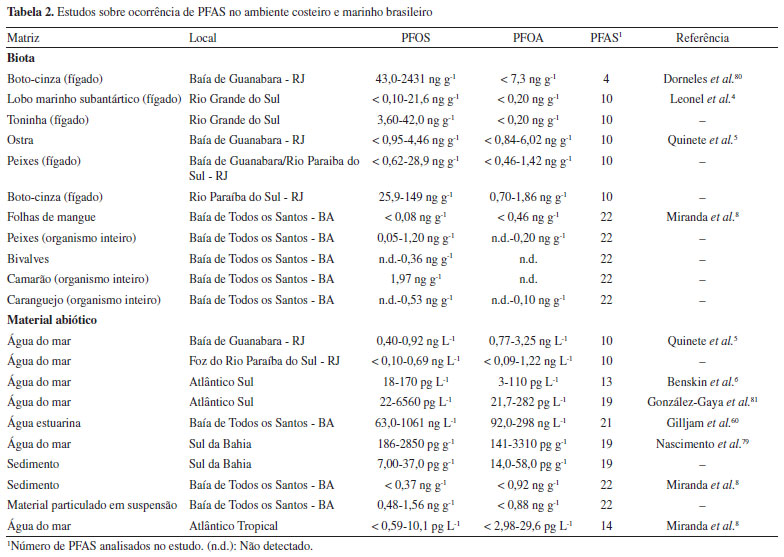 OCORRÊNCIA NO AMBIENTE MARINHO BRASILEIRO Apesar do amplo uso e ocorrência ambiental, poucos estudos avaliaram as concentrações e distribuição dos PFAS no ambiente marinho brasileiro, resultando em muitas lacunas quanto à ocorrência, distribuição e destino desses compostos (Tabela 2). Até o momento há três estudos realizados com amostras costeiras no estado da Bahia, três no Rio de Janeiro e um no Rio Grande do Sul. Adicionalmente há dados de três estudos realizados com amostras de água coletadas ao largo da plataforma continental brasileira.