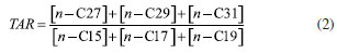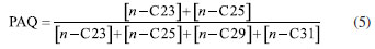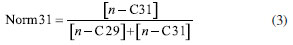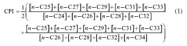 A análise do padrão de qualidade analítico adotado no presente trabalho foi realizada conforme proposto por Citac/Eurachem27. A cada 10 amostras, foi realizada a extração de uma amostra branco (Na2SO4 calcinado) para avaliar a presença de possíveis interferentes nas análises. As concentrações de todos os compostos estiveram menores que o LDM para as amostras branco analisadas. Para avaliar a repetibilidade e acurácia do método, devido à baixa massa das amostras coletadas no presente estudo, avaliou-se três amostras branco (sulfato de sódio calcinado) fortificadas com uma solução padrão (100 µL, 50 µg mL-1) contendo os n-alcanos de interesse. A recuperação dos compostos variou de 69 a 132% (Material Suplementar, Tabela 2S). O desvio padrão relativo das concentrações obtidas para as três amostras analisadas variou de 3,2 a 19% (Material Suplementar, Tabela 2S). Índices aplicados Baseando-se nas concentrações dos n-alcanos detectados, alguns índices foram aplicados para melhor entender a distribuição de M.O. para a região de estudo. O CPI (Índice Preferencial de Carbono) é uma relação entre as concentrações dos compostos com cadeias ímpares e pares de carbono e pode ser calculado através da seguinte equação:11,28 ![]() A TAR (Razão Terrígena-Aquática) verifica a importância de compostos de maiores massas moleculares sobre aqueles com menores massas moleculares, sendo calculada através da seguinte equação:29 ![]() O Norm31 avalia a relação entre as concentrações do n-C29 e n-C31, através da seguinte equação:30,31 ![]() O ACL23-33 (Tamanho Médio de Cadeia) descreve o número médio de carbono dos n-alcanos (com 23 a 33 átomos de carbono) presentes em uma região, podendo ser calculado através da seguinte equação:28 ![]() onde: Ci = n-alcanos com i números de carbono (i variando de 23 a 33). O PAQ (Índice de Produção Aquática) é utilizado para avaliar se a principal fonte de M.O. de uma região são as macrófitas emersas, flutuantes/submersas ou a vegetação superior, sendo calculado através da seguinte equação:12 ![]() Análise estatística O software BioEstat AnalysSoft, versão 6, foi utilizado na realização das correlações de Pearson feitas entre as variáveis analisadas (p < 0,05). O software Arcgis 10.1 (Envi, 2016) foi usado para confecção dos mapas.