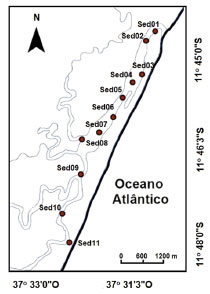 MATERIAIS E MÉTODOS Caracterização da área de estudo O estuário do Rio Itapicuru está localizado no Litoral Norte da Bahia, no município de Conde, entre as latitudes 11º44' - 11º49' S e as longitudes 37º30' - 37º35' O (Figura 1). Essa região é caracterizada por apresentar clima tropical úmido. As temperaturas médias são elevadas (entre 24 e 26 ºC), com variações térmicas entre 3 e 6 ºC. Os índices pluviométricos anuais são altos, variando entre 1000 e 1400 mm.19,20,21 O regime de maré da região em questão é do tipo semidiurno, com amplitudes máximas oscilando entre 2,0 e 2,5 m.22,23 As ações das ondas provenientes do sudeste e sul-sudeste, seguidas das marés, são os principais agentes hidrodinâmicos da região,24 controlando a distribuição sedimentar no canal estuarino e a deriva litorânea local para nordeste.22,23,24 A Mata Atlântica presente no município de Conde é dividida em ombrófila densa, mata ciliar, manguezal e restinga. A mata ombrófila densa apresenta grande número de espécies, com árvores uniformes e copas sobrepostas, dificultando a penetração de luz. As principais espécies de flora encontradas no município de Conde são: Inga sp. (ingá), Himatanthus sp. (leiteira), Chrysophyllum sp. (língua de vaca), Miconia albicans (canela-de-velho), Cecropia sp. (embaúba), Bowdichia virgilioides (sucupira), Tapirira guianensis (pau-pombo), Aristolochia brasiliensis (papo de peru), Rheedia brasiliensis (bacupari), Syagrus coronata (licuri), Croton sellowii (velame). Há ainda a presença de vegetação secundária nos mais variados estágios de desenvolvimento, onde as espécies típicas são: Bombax grandiflorum (imbiruçu), Caraipa densiflora (camaçari), Cariniana estrellensis (jequitibá), Brosimun sp. (garrote), Buchenavia sp. (muçambê), Clarisia sp. (oiticica), Copaifera sp. (copaíba), Couepia sp. (oiti), Lecytis sp. (sapucaia), Ocotea sp. (canela vernalha) e Nectandra sp. (louro). A mata ciliar do município de Conde não foi muito estudada, mas apresenta um elevado estágio de regeneração, sugerindo a presença de endemismos.24 Nos manguezais, as espécies mais características são Rhizophora mangle (mangue-vermelho), Avicennia schaueriana e Avicennia germinans (mangue-preto), Laguncularia racemosa (mangue-branco ou mangue doce) e Conocarpus erectus (mangue-de-botão). Nas áreas úmidas, que representam as áreas potencialmente inundáveis dos cursos d'água (brejos), podem ser observadas gramíneas (Paspalum maritimum, Spartina sp.), ciperáceas (Eleocharis sp., Cyperus sp., Scleria sp., Fuirena sp.) e taboa (Thypha domingensis). Já na restinga, tem-se como principais espécies vegetais: Croton sp. (velame), Tabebuia sp. (pau-dárco), Manilkara salzmanni (massaranduba-de-praia), Allagoptera sp. (palmeira caxulé), Bonnetia sp. (mangue doce), Pouteria sp. (bapeba), Humiria sp. (umirí), Hancornia speciosa (mangabeira) e Atallea funifera (piaçava). Grande parte do município do Conde está inserido nesse último tipo de cobertura vegetal.24 Coleta das amostras Em janeiro de 2017, amostras de sedimentos superficiais (n = 11, Figura 2) foram coletadas ao longo do estuário do Rio Itapicuru através do uso de uma draga de aço inox do tipo Van-Veen. Essas amostras foram armazenadas em um recipiente de vidro previamente calcinado (4 h a 450 ºC) e mantidas congeladas a -20 ºC. Em laboratório, elas foram liofilizadas e homogeneizadas.