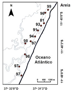 ![]() Figura 3. Distribuição do conteúdo de areia (%) encontrada ao longo do estuário do Rio Itapicuru