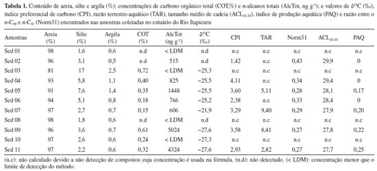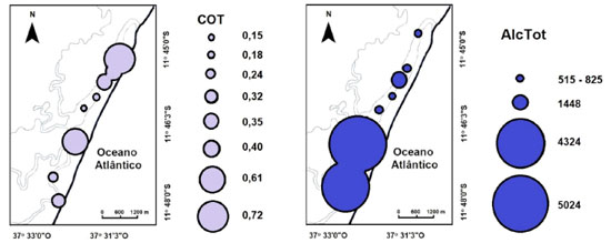 ![]() Figura 4. Distribuição das concentrações de carbono orgânico total (COT,%) e AlcTot (somatório da concentração de n-alcanos detectados, ng g-1) encontradas ao longo do estuário do Rio Itapicuru