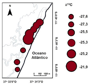 ![]() Figura 5. Variação espacial dos valores de δ13C (‰) encontrados ao longo do estuário do Rio Itapicuru