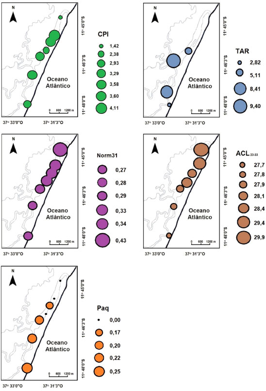 ![]() Figura 6. a) Mapas de distribuição dos valores de CPI (índice preferencial de carbono); b) TAR (razão terrestre-aquático); c) PAQ (índice de produção aquática); d) Norm31 (razão entre o n-C29 e o n-C31) e; e) ACL23-33 (tamanho da cadeia média) encontrados nas amostras coletadas no presente estudo