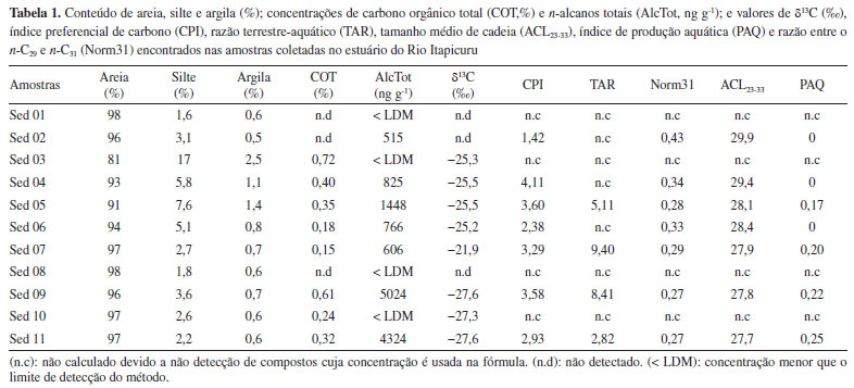 Os estuários são ecossistemas costeiros, onde a M.O. neles depositada pode ser alóctone ou autóctone.7 Para essa caracterização, pode-se utilizar marcadores orgânicos moleculares, como os n-alcanos. Esses são hidrocarbonetos alifáticos saturados de cadeias lineares, cuja principais fontes no ambiente marinho são os produtores primários marinhos e as plantas terrestres.8,9 A biossíntese dos n-alcanos se dá principalmente através da descarboxilação dos ácidos graxos, que possuem cadeias pares de carbono.10 Assim, n-alcanos biossintetizados têm, em geral, números ímpares de carbono na cadeia.11 Cadeias menores (de 15 a 17 átomos de carbono) são produzidas principalmente pelo fitoplâncton. As macrófitas tendem a produzir cadeias medianas de n-alcanos (n-C21, n-C23 e n-C25).12 As cadeias maiores (de 27 a 35 átomos de carbono) são produzidas principalmente por plantas terrígenas.13 Enquanto as plantas com padrão fotossintético do tipo C4 tendem a sintetizar maiores proporções de n-C31 e n-C33, as do tipo C3 sintetizam maiores proporções de n-C27 e n-C29.14 Assim, índices baseados na distribuição desses compostos podem ser usados na identificação das fontes de M.O. em uma região.13,15,16 Os isótopos estáveis de carbono também têm sido amplamente utilizados em estudos da identificação das fontes M.O. em ambientes costeiros. Os valores de δ13C dos organismos marinhos fotossintetizantes são dependentes da razão isotópica do carbono inorgânico dissolvido na água. Esse se apresenta sob três formas: CO2aq, HCO3- e CO32-. O CO2aq, quando comparado ao CO2 gasoso, é empobrecido em 13C; e o HCO3- e o CO32- são enriquecidos. O carbono orgânico de origem fitoplanctônica apresenta valores de δ13C variando de -23 a -12‰.17,18 Já o substrato de carbono para a vegetação superior é o CO2 atmosférico. Nas plantas do tipo C3, há uma maior discriminação do 13CO2 durante o processo de fotossíntese, fazendo com que os seus valores de δ13C sejam menores. Nas plantas do tipo C4, para evitar perdas de água, há uma redução no fluxo de CO2, que diminui a discriminação do 13C. O resultado desses diferentes modos de assimilação do CO2 pelas plantas superiores é expresso nos valores de δ13C encontrados no carbono orgânico total. Plantas do tipo C3 apresentam valores de δ13C variando entre -34 e -23‰. Plantas do tipo C4 apresentam valores de δ13C variando entre -17 e -9‰.17,18 O objetivo do presente trabalho foi avaliar as fontes da matéria orgânica depositada nos sedimentos superficiais do estuário do Rio Itapicuru (Litoral Norte da Bahia, Brasil). Este estudo é importante pois verifica quais as principais fontes de M.O. para um estuário tropical preservado. Deve-se destacar que são poucos os trabalhos feitos para essa região,1,3 o que faz relevante os dados gerados no presente estudo.