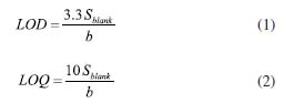 EXPERIMENTAL Instrument A visible spectrophotometer model V-1000 (AOE Instruments, Shanghai, Co. Ltd., China) provided with 1 cm matched quartz cells was used for measuring the absorbance. Chemicals and reagents All reagents and solvents used throughout this study were of analytical reagent grade. Solutions: 0.5% w/v bromocresol green (BCG) solution was prepared in dichloromethane (DCM), 0.5% w/v bromophenol blue (BPB) solution was prepared in DCM. Pharmaceutical grade TRH, which is certified to be 99.8% pure was received from the Shiba Pharma Company for Pharmaceutical Industries, Sana'a, Yemen, as a gift and was used as received. The commercial sample of the TRH drug chosen for determining TRH in capsules by the developed methods was triprolidine hydrochloride capsules-2.5 mg per capsule which is marketed by the United Laboratoriers Co. Ltd., Hong Kong, China. Standard TRH solution A standard TRH solution (200 µg mL-1) was prepared by dissolving 20 mg of pure TRH in DCM and diluting the solution to the mark in a 100 mL volumetric flask with DCM. A suitable dilution of this standard solution was done to prepare a working solution of 50 µg mL-1 TRH using DCM. Procedures Assay procedure of TRH using BCG Different volumes (0.5-3.0 mL) of a standard 50 µg mL-1 TRH solution were taken in a series of 10 mL volumetric flasks, and the total volume was adjusted to 3.0 mL by adding DCM. One milliliter of 0.5% w/v BCG solution was added to each flask. After 5 min, each flask was made up to the mark with DCM and mixed well. The absorbance of all solutions was measured at 415 nm versus a reagent blank. Assay procedure of TRH using BPB Different aliquots (0.5-3.0 mL) of a standard TRH solution (50 µg mL-1) were taken in a series of 10 mL volumetric flasks and the total volume was adjusted to 3.0 mL by adding DCM. A 1.5 mL of 0.5% w/v BPB solution was added to each flask. After 5 min, the flasks were made up to the mark with DCM and mixed well. The absorbance of these solutions was measured at 410 nm versus a reagent blank. Assay procedure for pharmaceutical formulations The content of twelve triprolidine hydrochloride capsules-2.5 mg TRH was weighed and an exactly weighed quantity equivalent to 5 mg of TRH was transferred into a 100 mL volumetric flask containing 50 mL of DCM. The content of the flask was shaken for about 15 min then the flask was diluted up to the mark with DCM. The contents were mixed well and filtered using a Whatman No. 42 filter paper. Suitable portions of the filtrate (50 µg mL-1 TRH) were used for analysis by the assay procedure using BCG and BPB methods as described earlier. Procedures for method validation The current ICH guidelines35 were used to validate the developed methods, and include linearity, limits of detection (LOD), limits of quantification (LOQ), precision, accuracy, robustness, and selectivity. Linearity was evaluated by analyzing a set of six standard solutions (0.5; 1.0; 1.5; 2.0; 2.5 and 3.0 mL of 50 µg mL-1 TRH solution) and the calibration curves were prepared as described under "assay procedure using BCG and BPB". The linearity of both methods was determined by plotting the absorbance against the concentration of TRH drug. The LOD (Equation 1) and LOQ (Equation 2) values for the developed methods were calculated using the following equations:36 ![]() where Sblank is the standard deviation of replicate blank absorbance (n = 6), and b is the slope of the calibration curve. The precision and accuracy of the developed methods were determined by preparation of solutions containing three different concentrations of TRH and analyze these solutions in seven replicates in the same day (intra-day) and five successive days (inter-day). The precision and accuracy of the developed methods were calculated in terms of percentage relative standard deviation (%RSD) and percentage relative error (%RE), respectively. The evaluation of the method robustness was accomplished by making small changes in some parameters, namely, volume of the dye (0.9, 1.0 and 1.1 mL for BCG method; 1.4, 1.5 and 1.6 mL for BPB method) and the reaction time (4, 5 and 6 min in both methods) and carrying out the analysis under the optimized experimental conditions followed by the calculation of %RSD values. To study the selectivity of the developed methods, a placebo blank was prepared by mixing known amounts of commonly employed excipients such as talc, starch, lactose, glucose, sodium citrate, acacia and gelatin and transferring this mixture into a 100 mL volumetric flask containing 50 mL of DCM. The solution was made as described under "Assay procedure for pharmaceutical formulations". A suitable aliquot of the filtrate was used for analysis by both methods following the assay procedures. To the placebo blank of the similar composition described above, 5 mg of pure TRH was added and mixed properly. A 50 µg mL-1 TRH solution of the synthetic mixture was also prepared as described under "Assay procedure for pharmaceutical formulations". The filtrate was collected in a 100 mL volumetric flask and 1.5 mL of the resulted solution (50 µg mL-1 TRH) was analyzed five times by both methods. Stoichiometric relationship To establish the stoichiometry of the formed ion-pair complexes in both methods between TRH and BCG or BPB, Job's method of continuous variations37 was used. In both methods, a 1.59 × 10-4 mol L-1 solution of TRH and 1.59 × 10-4 mol L-1 solution of BCG or BPB dyes were prepared by dissolving the calculated amount of drug and either dye in DCM. A series of solutions were prepared in different ratios of drug and BCG or BPB keeping the total volume of each mixture at 10 mL. The absorbance of all solutions was measured individually after 5 min at the respective wavelengths versus DCM. Procedures for optimization of reaction conditions The reaction conditions were optimized for the quantitative estimation of the yellow colored ion-pair complexes. These conditions included the selection