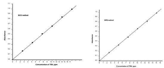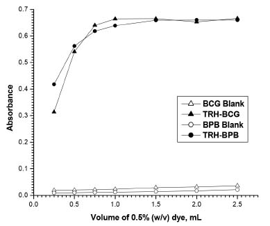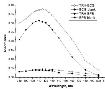 ![]() Figure 2. Absorption spectra of TRH-BCG and TRH-BPB ion-pair complexes (TRH 10 μg mL-1) against the corresponding blank