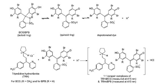 ![]() Figure 3. The possible reaction mechanism for the formation of TRH-BCG and TRH-BPB ion-pair complexes