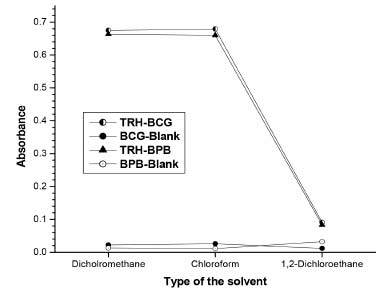 Reaction conditions optimization Effect of organic solvents The results of this study showed that the solvent 1,2- dichloroethane could not be used for preparation of dye's solutions and as a diluting solvent since there is no significant difference between the absorbance of the sample and the blank with this solvent (Figure 4). DCM and chloroform were found appropriate solvents for preparation of dye's solutions and as a diluting solvent, but the former (DCM) was preferred because of its availability.