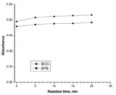 ![]() Figure 6. Effect of reaction time between TRH (7.5 μg mL-1) and BCG and BPB dyes