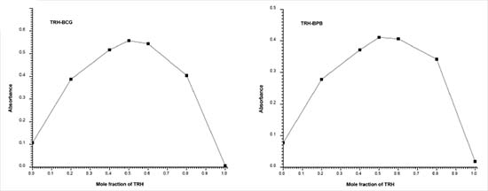 ![]() Figure 7. The Job's method of continuous variation plots for the formed (TRH-BCG & TRH-BPB) ion-pair complexes