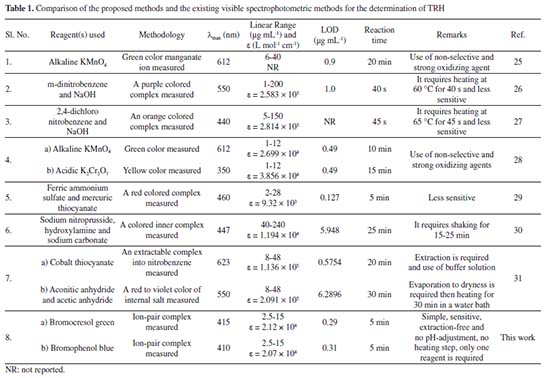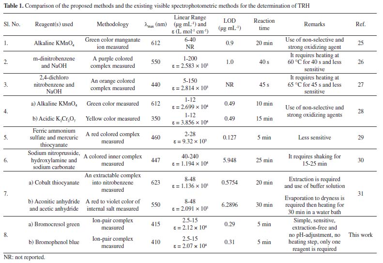A literature survey related to the quantitative analysis of TRH revealed that several studies have been reported for the determination of TRH, either alone or in combination with other drugs, in pharmaceutical formulations. These studies include high performance liquid chromatography (HPLC),3-10 ultra high performance liquid chromatography (UHPLC),11 thin layer chromatography (TLC),12 electroanalytical methods,13-17 chemiluminescence method combined with flow injection analysis (FIA),18 capillary zone electrophoresis (CZE),19 ultraviolet (UV) spectroscopy4-6,20-24 and visible spectroscopy.25-31 Visible spectrophotometry, due to its simplicity, cost effectiveness, sensitivity, selectivity, and easy access in many quality control laboratories, has been widely used in pharmaceutical analysis. The importance of the spectrophotometric methods lies in the nature of chemical reaction(s) upon which the procedures are based rather than upon the sophistication of the instrument. Many reactions involving the formation of the color for a particular drug are quite selective or can be rendered selective through the optimization of some conditions. Although the previously developed methods can be used, most of them require expensive instruments or substances, and many laboratories in under-developing countries cannot afford to purchase and maintain these instruments. The UV spectrophotometric methods have limitations since they may suffer interference from the excipients used in pharmaceutical formulations when determining the active drug materials. Also, many of the previously developed visible spectrophotometric methods suffered from some disadvantages like the use of non-selective and strong oxidizing agents,25,28 heating step,26,27,31 less sensitivity,26,27,29 shaking for long time30 and extraction step31 as explained in Table 1.