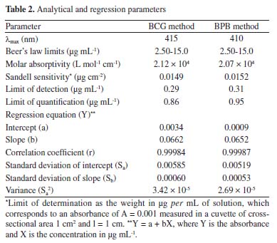 Effect of dye concentration The results showed that maximum color development of the ion-pair complexes was attained with 1 mL of BCG solution and 1.5 mL of BPB solution and the absorbance of the formed complexes was not affected by excess dyes (Figure 5).