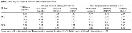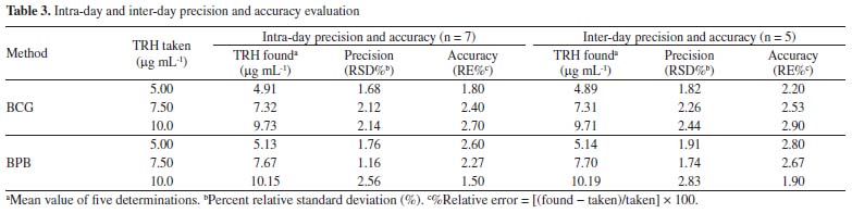 CONCLUSIONS This is the first time bromocresol green and bromophenol blue have been used to determine the TRH drug spectrophotometrically. The methods presented in this study were established to be simple, sensitive, selective, cost-effective, accurate, precise, and robust; so that, they can be extensively applied for the determination of TRH in commercial capsules. Both methods depend on the addition of dye solution to the drug solution and the procedures do not involve any disadvantages like pH adjustment, heating or extraction steps. The developed methods depended on the mixing of the drug and dye solutions in dichloromethane solvent followed by measuring the absorbance of the formed ion-pair complex in both methods. In addition, these methods showed good accuracy and precision which made these methods suitable for the routine analysis of TRH in the quality control laboratories in pharmaceutical industries. Finally, no interference was observed from the excipients that might be present in the commercial capsules.