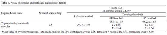 Selectivity The selectivity of the developed methods was studied using both placebo blank and synthetic mixture analyses. The solutions of both placebo blank and synthetic mixture were prepared as mentioned under the experimantal part "Procedures for method validation". The resulting extract of placebo blank was analyzed and the measured absorbance was as same as reagent blank, which concludes that the employed excipients didn't interfere with the assay using the developed methods. Upon analysis of the resulting extract of synthetic mixture, percent recoveries of TRH were found to be 98.41 ± 1.87 and 97.93 ± 2.39 (n = 5) for BCG and BPB methods, respectively. These results confirm the selectivity of developed methods. Robustness The effect of the changes made in the volume of the dye and reaction time on the absorbance of the formed ion-pair complexes in both methods were studied and found to be very small (RSD% were less than 1.86%) confirming the robustness of the developed methods. Application to the assay of capsules The developed methods were successfully applied for the determination of TRH in representative capsules i.e. triprolidine hydrochloride capsules-2.5 mg. The same capsules were also assayed by a reference method41 and we compared the results of the developed methods with those of the reference method using Student's t-test and F-test. Reference method involves a non-aqueous titration in which an accurately weighed of TRH was dissolved in a glacial acetic acid followed by the addition of mercuric acetate, then titration with 0.1 N perchloric acid with potentiometric detection of the end-point. All experimentally calculated t- and F-values were presented in Table 4 and found to be less than the tabulated ones, indicating a close similarity between the developed methods and the reference method with respect to accuracy and precision.