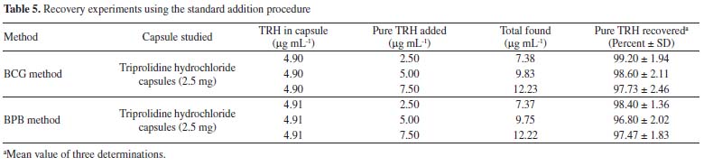 Recovery study The accuracy of the developed methods was further confirmed by performing recovery experiments using the standard addition procedure. Pre-analyzed capsule's powder (triprolidine hydrochloride capsules-2.5) was spiked with definite amounts of pure TRH at three different concentration levels (50, 100 and 150% of the quantity present in the capsule powder). The total was measured by the developed methods and the percent recovery of the added pure drug was calculated. Results of this study were presented in Table 5 and showed that no interference was observed from the various excipients present in the capsules.