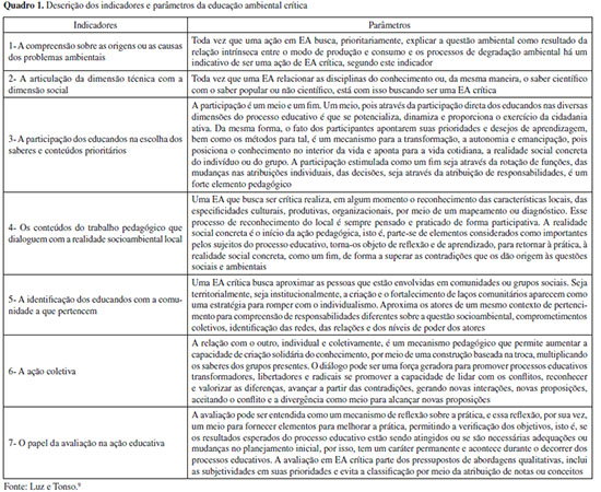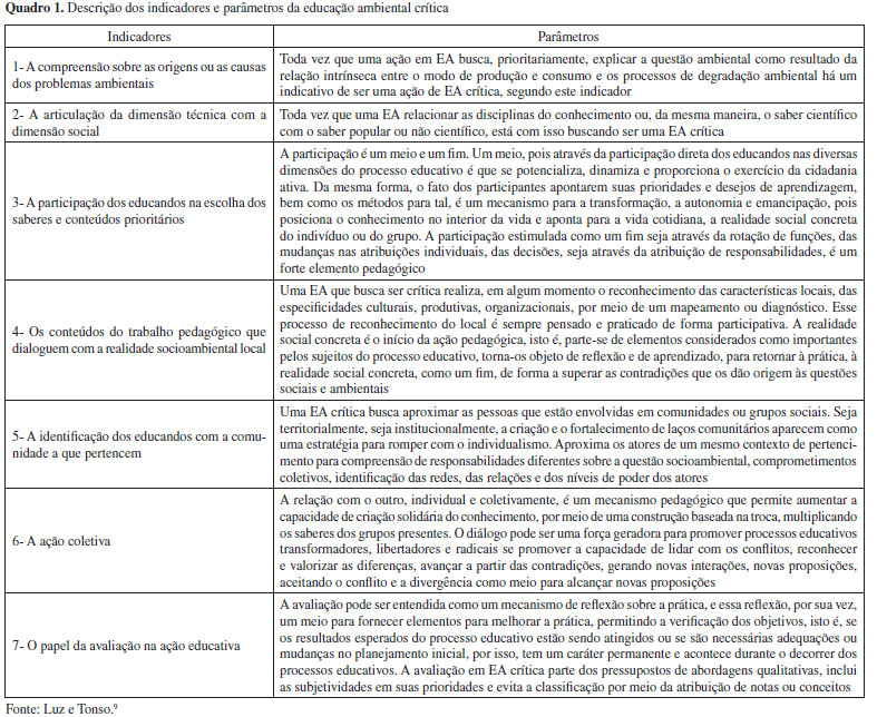 FUNDAMENTAÇÃO TEÓRICA Aspectos principais da educação ambiental crítica: indicadores e parâmetros A EAC estrutura-se no ideal das interconexões, inter-relações, interações e interdependências existentes entre todos os elementos pertencentes a Gaia, e as multidimensionalidades das esferas que os cercam, bem como, em suas complexidades, ou seja, "[...] uma visão sistêmica de meio ambiente, compreendido em sua totalidade complexa como um conjunto no qual seus elementos/partes interdependentes interrelacionam entre si, entre as partes e o todo, o todo nas partes em uma interação sintetizada no equilíbrio dinâmico".10 Desse modo, a EAC busca restabelecer as relações sociais para/com o ambiente, como modo de incentivar e efetivar ações mais harmônicas para assim, romper com processos de apropriação e exploração do ser humano com o meio natural. Sendo assim, por intermédio do desenvolvimento da EAC, torna-se possível criar caminhos e condições que são capazes de romper com os atuais paradigmas, pautados em modelos lineares e dominantes de exploração da natureza e do quadro insustentável que está instaurado, e assim, transformá-las em uma cultura de participação ética e responsável para o enfrentamento das tais problemáticas.11,12 Neste viés, considera-se a relevância de ações formativas e da produção de materiais didáticos que oportunizem momentos de debates, reflexões, estudos e trocas de experiências, para docentes da área das Ciências da Natureza em formação inicial e/ou continuada, como modo de possibilitar meios para uma formação cidadã, e uma percepção de mundo de maneira mais crítica e responsável, visando ações sensíveis para/com a Terra, e assim, exercendo papel social de modo sensível e respeitando o ambiente. Luz e Tonso9 construíram sete indicadores e parâmetros da EAC, alicerçados na busca por considerações sobre como a prática crítica da Educação Ambiental (EA) vem sendo realizada e como é possível identificar tais ações. Desse modo, por intermédio de pesquisas bibliográficas e entrevistas com sujeitos atuantes na área, Luz e Tonso9 propuseram indicadores e parâmetros para nortear a análise das práxis docentes e dos debates acerca das questões acima levantadas. Os referidos indicadores, estão pautados em concepções complexas no que diz respeito às avaliações na EAC, uma vez que ela não se limita a conteúdos e seus aprendizados de forma única, mas sim na diversidade de estratégias, de maneira flexível e múltipla e, em um processo de humanização, no qual visa identificar como o ser humano estabelece relações com o mundo.9 Ainda, segundo os autores,9 para que se desenvolva de maneira correta o processo de avaliação "[...] é central entendê-la em íntima relação com os objetivos da ação ou do processo educativo. Por isso a importância de que a avaliação seja compreendida, em um par dialético, com os objetivos da proposta educacional, na forma da dupla objetivos/avaliação".9 Diante disso, a relação entre os sete indicadores e seus respectivos parâmetros possibilitam caminhos para uma avaliação de EAC, conforme Quadro 1. Por fim, considerando o Quadro 1, Luz e Tonso9 explicam que "indicadores são elementos que nos mostram algo que não pode ser diretamente observado ou medido. São signos que revelam aspectos de uma determinada realidade [...]" e os "parâmetros são como os limites dos indicadores, dizem-nos de onde para onde um indicador faz sentido e referem-se às características dos indicadores. Os parâmetros nos permitem comparar as possibilidades e os limites de cada indicador".
