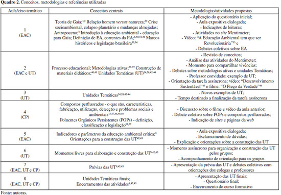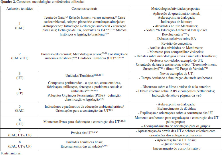 PERCURSO METODOLÓGICO O curso de extensão contou com 24 participantes, sendo estes professores em formação inicial e continuada, das áreas de Ciências, Química e Biologia da Universidade Federal do Rio Grande do Sul (UFRGS) e de escolas públicas estaduais da EB. A formação foi realizada com encontros semanais, em atividades assíncronas e síncronas, por intermédio da plataforma virtual de ensino da universidade, totalizando 40 horas. Assim, foram realizados 8 encontros síncronos, por meio da referida plataforma virtual, com duração de 2 horas cada encontro, totalizando 16 horas. As demais horas foram referentes às reuniões de acompanhamento com os grupos, para orientações sobre a elaboração dos trabalhos (8 horas) e tempo livre para organização interna dos grupos e construção das UT (16 horas). Nos períodos síncronos, foram desenvolvidas diversas atividades e debates relacionados aos três principais eixos formativos definidos para o curso: Educação Ambiental Crítica (EAC), Unidades Temáticas (UT) e Compostos Perfluorados (CP), conforme ilustrado no Quadro 2.