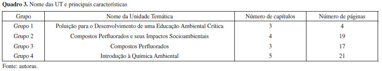 RESULTADOS E DISCUSSÕES Panorama sobre conceitos, propostas didáticas e atividades das UT Com o desenvolvimento do curso, foi possível construir quatro grupos de trabalho, que produziram quatro UT. Para melhor reconhecimento, todas as UT são apresentadas nos Quadros 3 e 4, com os respectivos títulos atribuídos pelos grupos, número de páginas e capítulos, e ainda, suas características em termos de conceitos científicos e abordagens didáticas, respectivamente.