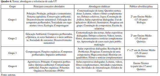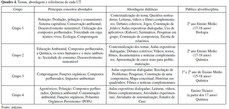 As quatro produções apresentam as características esperadas para uma UT,24 como guia para os discentes e docentes, materiais e recursos alternativos, roteiros de aulas com leituras, jogos, indicação de filmes, simulações, propostas de trabalhos em grupo, discussões e atividades de campo, além de propostas avaliativas. Os capítulos foram organizados de forma a serem utilizados independentemente ou em sequência, conforme planejamento e opção dos futuros usuários dos materiais didáticos. A diversidade de abordagens didáticas pode ser ilustrada no Quadro 4. O Quadro 4, indica de maneira sintetizada as principais abordagens escolhidas pelos grupos para o desenvolvimento da temática dos CP dentro das UT. De modo geral, pode-se indicar uma grande diversidade de atividades propostas pelos participantes, assim como também semelhanças entre elas, isso pode ser devido às indicações e sugestões realizadas no curso formativo no qual estiveram presentes. Entre as compatibilidades das produções, apresenta-se o vídeo "Desenvolvimento Sustentável"45 encontrado no canal do YouTube da Rita Von Hunty, e o filme "O Preço da Verdade"46 como indicações no decorrer das UT. Estes materiais foram utilizados e mencionados no curso e se destacam por abordarem conceitos chaves para fomentar as discussões das UT. Mesmo com semelhanças, outros materiais utilizados, indicações e propostas realizadas foram contempladas e apresentaram-se diversificadas e ricas, em que, cada grupo buscou abordar de sua maneira a temática em questão, como observa-se no Quadro 4. Foram propostos estudos de caso, construção de composteiras, elaboração de folders, seminários, utilizados aplicativos de jogos virtuais, e ainda, uma variada lista de textos, vídeos e filmes complementares, determinados por cada grupo. A adequação das abordagens também foi observada de acordo com o nível e o ano de estudo de cada público escolhido. Maiores detalhes sobre as UT podem ser conferidas a seguir. O grupo 1 estruturou a UT em três seções. A parte inicial objetivava conceituar e discutir questões relacionadas à poluição e impactos ambientais, compreendendo quais suas origens e realizando reflexões sobre os efeitos gerados pelas diferentes escalas da sociedade, como as grandes empresas, e ainda, os modelos de consumo, produção e descartabilidade associados à crise socioambiental. Nesta seção os docentes propõem leituras complementares, debates coletivos por intermédio de questões problematizadoras e momentos reflexivos acerca do vídeo da Rita Von Hunty sobre "Desenvolvimento Sustentável".45 Além disso, planejou-se utilizar um jogo denominado "Caminho do Lixo" e a construção de um folder sobre a poluição, como modo de divulgar a ciências à comunidade escolar. No segundo capítulo, adentra-se na temática dos perfluorados e suas interações com os seres vivos, no qual, busca-se debater sobre esses compostos e como ocorre seu descarte no ambiente, para assim construir os conceitos acerca de sua toxicidade, e abordar os conteúdos de ecologia, cadeias tróficas, biotransformação e biomagnificação. Tudo isso é desenvolvido a partir do filme "O Preço da Verdade".46 Ainda, é proposto um quiz participativo, por meio do Kahoot, e a apresentação de um seminário em grupo sobre uma pesquisa relacionada às diferentes classes de poluentes e sua interação com os seres vivos. Por fim, o terceiro e último capítulo da UT construída pelo primeiro grupo, buscou abordar sobre a compostagem e a relação com os alimentos, desde a produção até o descarte, englobando legislação ambiental, destinação e aproveitamento. Para tanto, relaciona-se às discussões com os conceitos de seres detritívoros e decompositores e seus mecanismos de ação. São utilizadas questões norteadoras para os debates, e proposto a construção de uma composteira, com posterior escrita de relatório. A UT elaborada pelo grupo 2, é dividida em quatro capítulos. Em seu primeiro momento se introduz sobre os conceitos da EAC e meio ambiente, através de aulas expositivas dialogadas, apresentação de dados científicos, questões problematizadoras e debates coletivos. O vídeo "História das Coisas"54 é sugerido para fomentar as discussões sobre as ações humanas e os impactos ambientais, e o desenvolvimento da ciência e da tecnologia. A partir daí, adentra-se no segundo capítulo, no qual são abordados os CP, com definições, modos de produção e aplicabilidade. Leituras complementares são indicadas ao longo de todo material, como modo de instigar os debates sobre a relação dos CP com os seres humanos e o meio ambiente, além do filme "Erin Brockovich: Uma Mulher de Talento".55 No terceiro capítulo segue-se com as discussões sobre os CP, agora relacionando o aumento de seu uso, com aspectos do consumismo, e como interferem no meio ambiente, em decorrência de suas propriedades físico-químicas. Para isso, é mencionada a utilização do vídeo "Sociedade do Consumo",56 visando estimular as reflexões e adentrar no último capítulo, que contempla os conceitos químicos da temática, como estruturas, propriedades relacionadas, Química Orgânica, e Poluentes Orgânicos Persistentes (POPs). O grupo 3 construiu uma UT que foi subdividida em três capítulos. A temática dos CP apresentada por intermédio de discussões interligadas à construção de uma composteira, assim, na primeira seção, foi conceituado sobre biodecompositores por meio da discussão de uma história em quadrinhos e proposto o estudo sobre os processos químicos que estão envolvidos na compostagem. Como atividade deste capítulo, os docentes propõem a Resolução de Problemas, com os resultados apresentados no formato de mapas conceituais. Ainda, é proposto a construção de um material de divulgação científica com explicações e orientações para a comunidade escolar de como construir e manter uma composteira em casa.