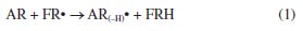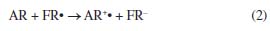 HAT and SET mechanisms Note that from the MEP surfaces depicted in Figure 8, it is possible to qualitatively infer the ability of a molecule to be an antioxidant. However, it is also possible to evaluate the antioxidant capacity of a compound by analyzing its hydrogen atom transfer capacity (HAT) or by a single electron transfer (SET) to free radical (FR).40,41 In this sense, the analysis of the thermochemistry in which a hydrogen bond is broken and the hydrogen is transferred to a free radical is relevant to understanding the HAT mechanism,40-43 which can be summarized by the reaction 1:44 ![]() According to this reaction, a hydrogen atom is transferred from the antioxidant (AR) to the free radical (FR) and produces a non-radical product (FRH) that is unable to propagate the chain reaction.43 Thus, a negative value of Gibbs free energy indicates that the reaction is exergonic and energetically possible. In this work, we computed the adiabatic Gibbs free energy for reaction 1, considering that AR (eugenol or vitamin C) is interacting individually with the following free radicals: CH3O, CH3, HOO, OH, and NO2. The results are reported in Tables 1S and 2S as supplementary material. In all cases, the more negative values for Gibbs free energies are related to HAT from eugenol to FR, suggesting a better antioxidant capacity of eugenol. Additionally, SET was evaluated by the following reaction:44,45 ![]() In reaction 2, a cation radical (AR+) is formed and a single electron is transferred to the free radical (FR). The Gibbs's free energies associated with these reactions are reported in Table 3S as supplementary material. In all cases the single electron transfers from eugenol to FR requires less Gibbs free energy in comparison to vitamin C, which agrees with the evidence provided by the HAT mechanism.