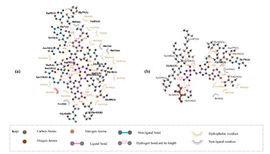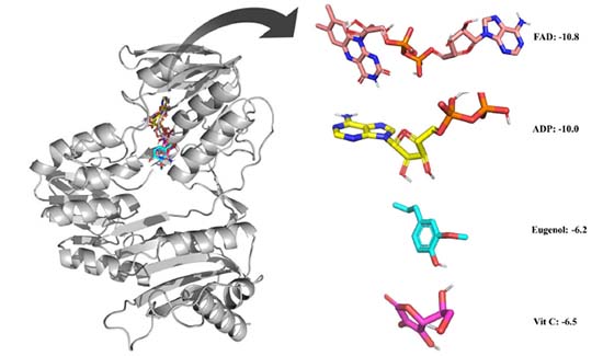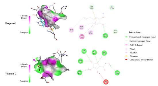 Eugenol was examined for its ability to bind to an NADPH oxidase protein target. The results were compared with vitamin C. By introducing the selected ligands into the NADPH oxidase without the initial inhibitor, and molecular docking was achieved. Binding affinity energies were assigned a numerical value. Figure 2 shows the docking results of the compounds and vitamin C. The binding affinity energies of eugenol were measured for the NADPH oxidase target, with a binding affinity of -6.2 kcal mol-1. Vit C displayed comparable docking confirmation, with a binding affinity of -6.5 kcal mol-1.