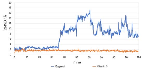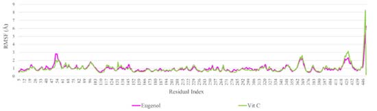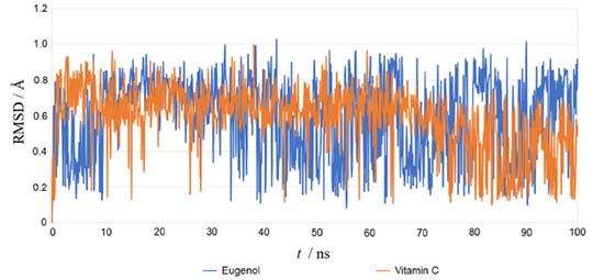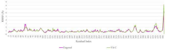 Using the re-docking technique, the current study validated the docking procedure for docked molecules obtained by AutoDock Vina. The PDB format of the co-crystal ligand (ADP) was obtained from the "Protein Data Bank Japan database" (https://pdbj.org/chemie/summary/ADP). The co-crystal ligand (ADP) was re-docked into the catalytic binding site of NADPH oxidase using the previously described technique; the observed binding energy was -10.0 kcal mol-1. When the resulting conformer was superposed in the active pocket of the NADPH oxidase, it was revealed to have a significant overlap with the co-crystal ligand. The PyMol software was used to compute the RMSD between the re-docked complex and native co-crystal ligand positions. The calibration of the docking procedure was confirmed by a low RMSD value of less than 2 Å. An RMSD of less than 2 Å is appropriate for computational validation of the ligand-protein.34,35 MD simulations The Desmond package (Schrodinger 2019-4) was used to undertake a molecular dynamics simulation to examine the stability of ligand-protein docked complexes of the NADPH oxidase receptor with ligands eugenol and vitamin C. 2CDU-eugenol, and 2CDU-vitamin C complexes were used in molecular dynamics simulations. When calculating the scalar distance between the protein (Cα backbone) and the ligand throughput trajectory, the RMSD values of the protein and ligand complexes were used to investigate the response of MD. Accordingly, the RMSD method measured protein backbone and ligand-protein complex structural stability. Figure 4 depicts the results as a function of the simulation time. During the 100 ns simulation interval, the eugenol ligand showed an acceptable variance (< 3 Å) in structural conformation until 35 ns, then fluctuated and then somewhat normalized at 95 ns for the duration of the simulation. Despite this, the control ligand (Vit C) remained very steady (< 2 Å) during the whole simulation time. The RMSD of ligands as a function of simulation time (Figure 5) reveal that the eugenol molecule and the control ligand Vit C travel approximately 0.8 Å relative to their reference location within the active site throughout the simulation period.