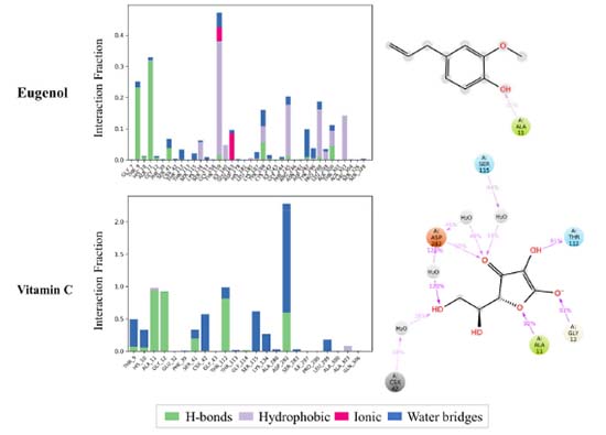 Furthermore, the stability of docked NADPH oxidase-ligand complexes was investigated for intermolecular interactions between proteins and ligands such as hydrogen bonds, hydrophobic, ionic, and water bridges (Figure 7). The docked ligands interacted well with the amino acid residues in the selective pocket of the 2CDU crystal structure throughout the 100 ns simulation run. Furthermore, 2CDU protein-ligand interactions with docked ligands showed significant hydrogen bond, hydrophobic, and water bridge formation. The selected eugenol was assessed for hydrogen bond interactions with critical residues (ALA 11) in the selective pocket of NADPH oxidase compared to the control ligand (Vit C). Compared to the control ligand, the eugenol ligands had a similar binding orientation and very considerable stability in the selective pocket of 2CDU.