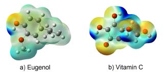 Molecular electrostatic potential (MEP) A study of the charge density distribution on a molecule is useful to find the charge abundance and charge deficiency sites on it. In this sense, the determination of this charge distribution is generally possible through an analysis of the molecular electrostatic potential (MEP). Thus, MEP surfaces allow us to identify the nucleophilic and electrophilic sites on the compound. Figures 8a and 8b depicts the potential surface of eugenol and vitamin C, respectively. The MEP surfaces are ranged from -0.07862 a.u. (deepest red) to 0.07862 a.u. (deepest blue). In these Figures a red colour indicates the existence of a higher electron density site while the blue colour is related to charge deficiency while the shaded red colour indicates the presence of electron pair in that region. Thus, the deep blue colour near the hydrogen atoms around the ring indicates the presence of maximum positive charges in that region and these sites are mostly preferential for the nucleophilic attack. On the other hand, note that for eugenol and vitamin C, in all cases the electrophilic sites are located near to the oxygen atoms. Thus, in the case of eugenol the -OH and -OCH3 sites, and -OH and -CO functional groups in vitamin C can be considered as are highly abundant for the antioxidant activities.38,39 Also, from these MEP surfaces, vitamin C exhibits more active hydrogen atoms in comparison with eugenol.