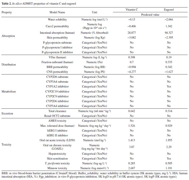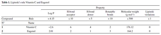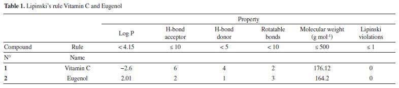 Vitamin C and eugenol respect the conditions mentioned in Lipinski's rule, without any Lipinski violations. The ADMET prediction was used in this study to calculate the pharmacokinetics parameters of vitamin C and eugenol that respect the conditions mentioned in Lipinski's rule (Table 2).