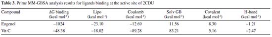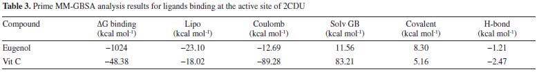 Prime MM-GBSA calculation Additional analysis was performed using 200 pictures with a 50 ps gap to establish the average binding energy for an equilibrated MD trajectory. The binding energy was calculated using the previously known formulae.37 Schrödinger's thermal mmgbsa.py python script was used to calculate the average MM-GBSA binding energy, as well as the Coulomb (Coulomb), lipophilic energy (Lipo), generalized Born electrostatic solvation energy (Solv GB), covalent binding energy (Covalent) and hydrogen-bonding energy (H-bond). The data collected is summarized in Table 3. In comparison to the control ligands, eugenol has high binding energy with lipophilic energy, according to the MM-GBSA data (Vit C). On the other hand, the eugenol ligand had a more unfavorable Coulomb energy.