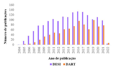 ![]() Figura 2. Gráfico representativo mostrando o número de trabalhos publicados utilizando as técnicas de DESI (2004-2022) e DART (2005-2022) (fonte: Web of Science, acesso em 19 de janeiro de 2022)