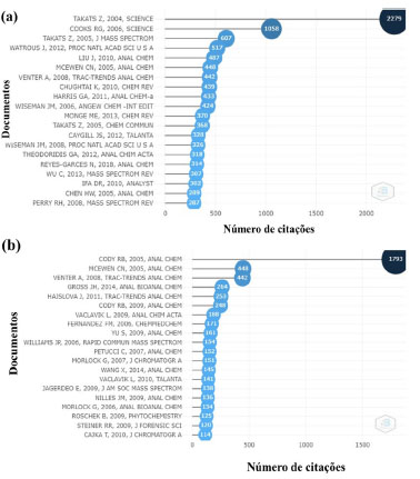 ![]() Figura 3. Gráfico representativo mostrando os 20 artigos mais citados com número de citações, utilizando as técnicas (a) DESI e (b) DART (fonte: Web of Science, acesso em 19 de janeiro de 2022 e Bibliometrix)7