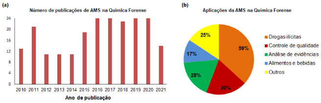 ![]() Figura 4. (a) Gráfico representativo mostrando o número de trabalhos publicados na última década utilizando a técnica de AMS na Química Forense (termos: "AMS" e "Forensic Chemistry"), e (b) os tipos de áreas de aplicações de AMS na Química Forense (fonte: Web of Science, acesso em 29 de julho de 2021)