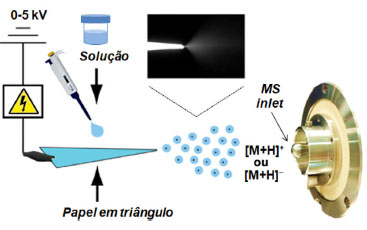 Particularmente a técnica de PSI-MS é muito popular dentro da Química Forense e compreende mais de 45% de todas as publicações nessa área de estudo na última década, de acordo com levantamento realizado na plataforma Web of Science. Essa importância da PSI-MS deve-se muito à sua praticidade, velocidade de análise, baixo custo, necessidade de uma quantidade menor de amostra e a sua reprodutibilidade, como pode ser comprovado em estudos prévios sobre falsificação de documentos,33 explosivos,34 segurança alimentar,35 adulteração de bebidas,36 e drogas de abuso.37-39 A PSI-MS é considerada como uma técnica barata pois não necessita do uso de gases nebulizadores, como é o caso da ESI, e caracteriza-se por empregar um pedaço de papel constituído normalmente de celulose purificada, que é cortado em formato triangular, com pontas afiadas, e mantida por um clipe metálico com a parte aguda direcionada em frente à entrada do equipamento MS a uma distância que varia em poucos milímetros, de acordo com a ilustração da Figura 5.40 A aplicação de uma alta tensão desencadeia a formação de um spray proveniente da solução da amostra que é adicionada em um volume de microlitros na superfície do papel. Ocasionalmente, uma quantidade mínima de solvente puro é adicionada para ajudar a dessorção dos analitos da superfície do papel a partir da ruptura das interações entre os analitos e as fibras porosas hidrofílicas do papel celulósico que retém a amostra adsorvida.41