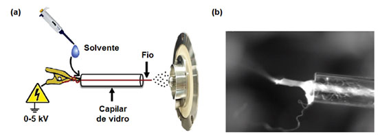 ![]() Figura 6. (a) Esquema experimental da técnica de ionização em fio. (b) Formação do cone de Taylor na ponta do fio de tecido (fonte: adaptado de Jackson et al.,65 copyright (2018) Elsevier B.V)