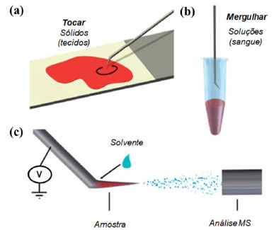 ![]() Figura 7. Amostragem de (a) sólidos: tecidos biológicos, e (b) líquidos: sangue, utilizando TSI-MS. (c) Aplicação de alta voltagem e solvente para a emissão de gotas de analito ionizado (fonte: adaptado de Kerian et al.,26 copyright (2014) The Royal Society of Chemistry)
