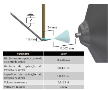 A praticidade da TSI-MS pode ser verificada na etapa de amostragem, na qual o material a ser analisado pode ser adsorvido pela sonda de forma simples e variada, por exemplo: tocando, mergulhando, arranhando ou golpeando a amostra. Após a amostragem, a sonda contendo o material a ser analisado é direcionada em frente à entrada do espectrômetro de massas e conectada à fonte de alta voltagem, e quando se aplica solvente orgânico o electrospray é formado.26 A técnica de TSI-MS não necessita, essencialmente, do uso de sondas constituídas de materiais específicos ou com formatos pré-determinados, mas estas devem permitir uma eficiente amostragem, uma segura transferência do material, acomodar o solvente aplicado e promover o seu fluxo no spray e, assim, facilitar o processo de extração do analito e de produção de partículas carregadas (Figura 8). No entanto, materiais que permitem uma ótima adsorção, extração, separação e ionização da amostra apresentam vantagens na análise de materiais utilizando a TSI-MS.26