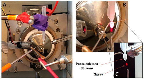 ![]() Figura 9. Representação do experimento de TSI-MS utilizando swab de micro-amostragem por absorção volumétrica. (A) Visão frontal mostrando o swab ao centro, a agulha de alta tensão à esquerda, e a seringa de solvente de eluição à direita. (B) Imagem ampliada da ponta de amostragem do swab. (C) Monitoramento da formação do electrospray na ponta do swab utilizando uma caneta laser (fonte: adaptado de Morato et al.,79 copyright (2019) American Chemical Society)