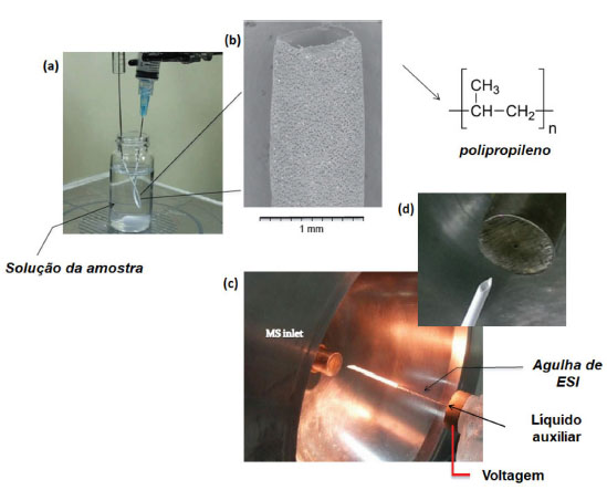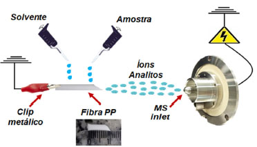 Em 2020, Allochio Filho et al.90 aplicaram uma fibra oca de PP na FSI-MS (ver Figura 11) para avaliação de amostras apreendidas de drogas, como comprimido, papel mata-borrão, haxixe e COC em pó e em uma amostra de urina de um caso de abuso de drogas. Além disso, um estudo quantitativo da COC por FSI-MS foi realizado diretamente da urina, sem qualquer pré-tratamento de amostra. Assim, a fibra de PP foi mergulhada na solução e, em seguida, comparada com resultados obtidos usando PSI-MS. O método de FSI-MS se mostrou eficaz como técnica de AMS e apresentou sensiblidade maior que o PSI-MS.